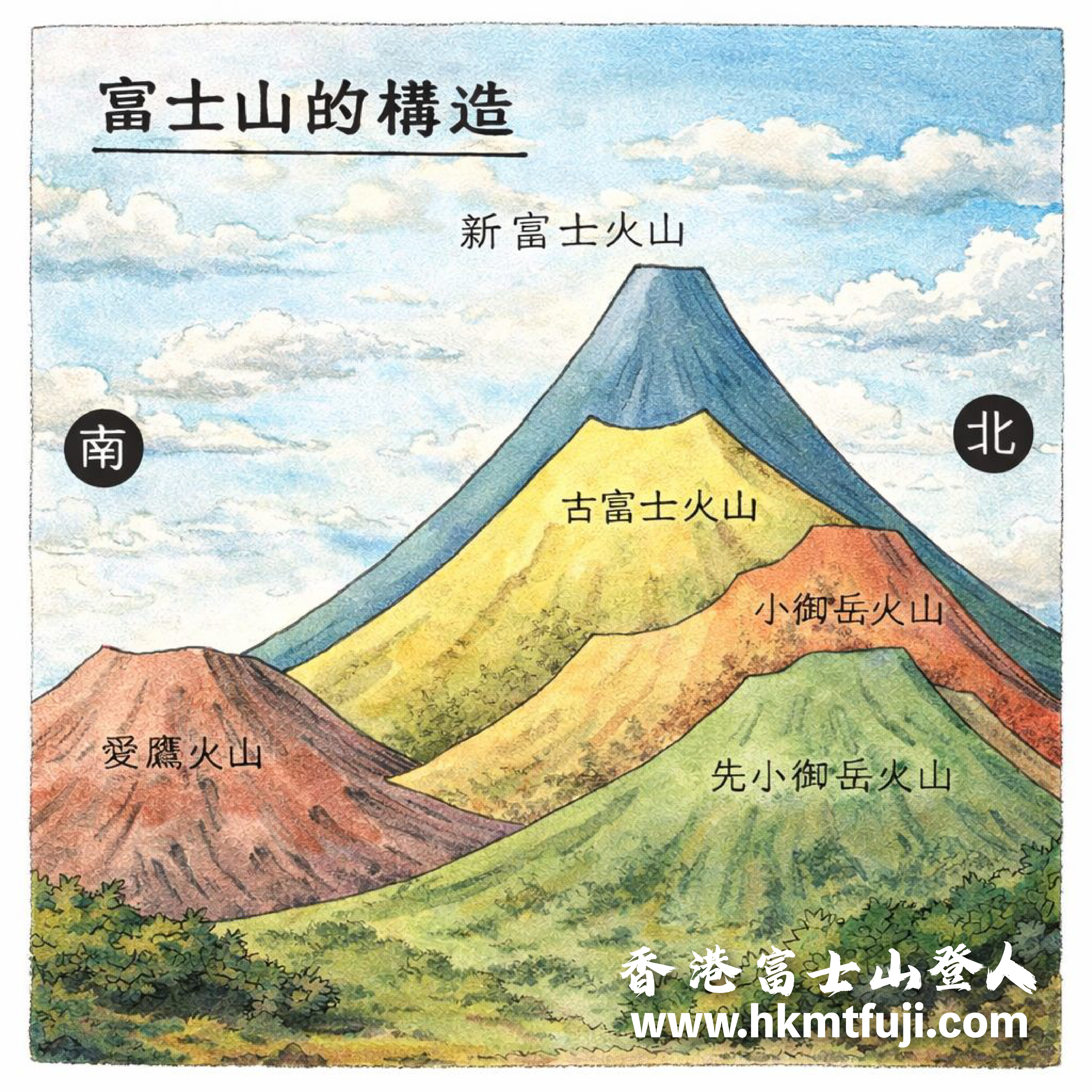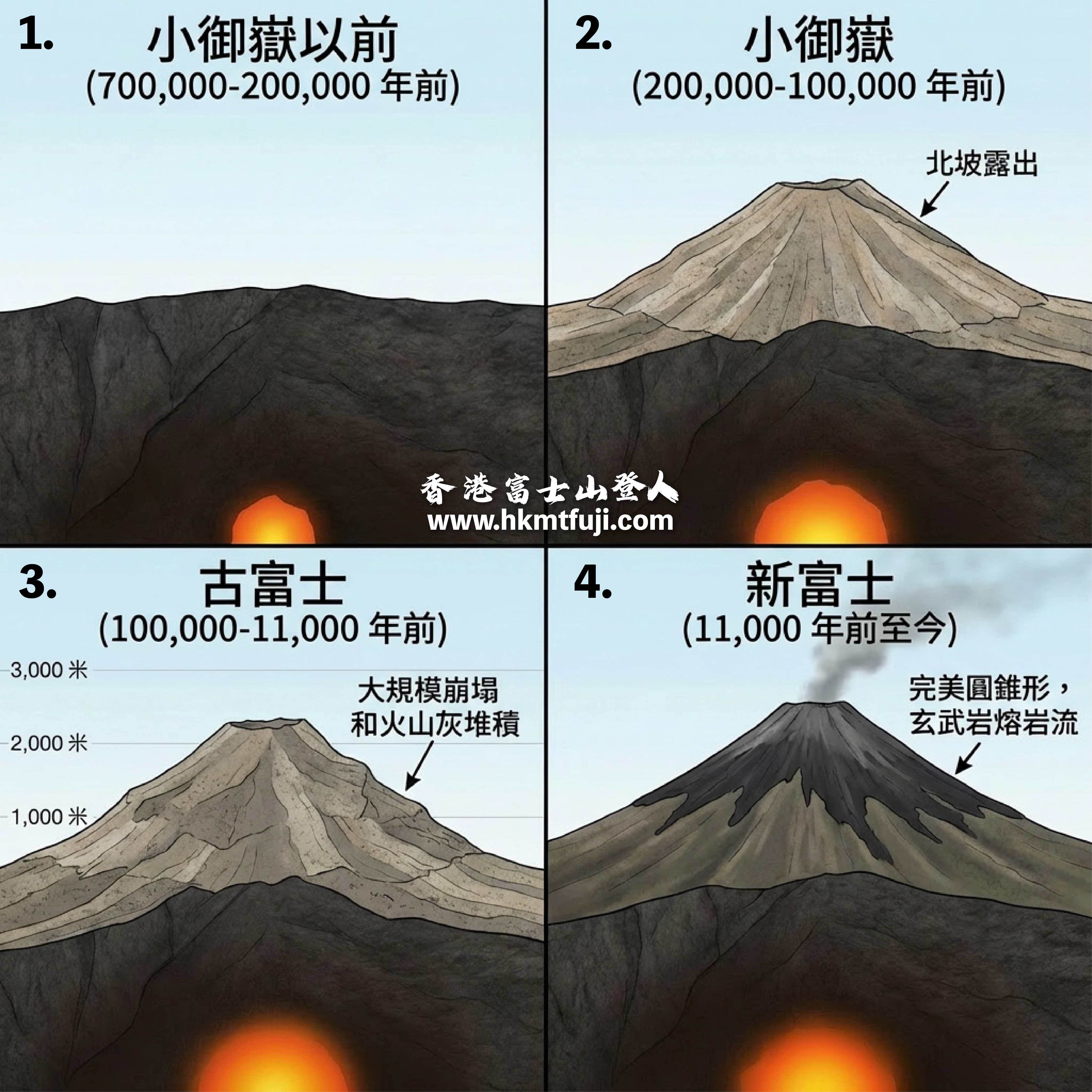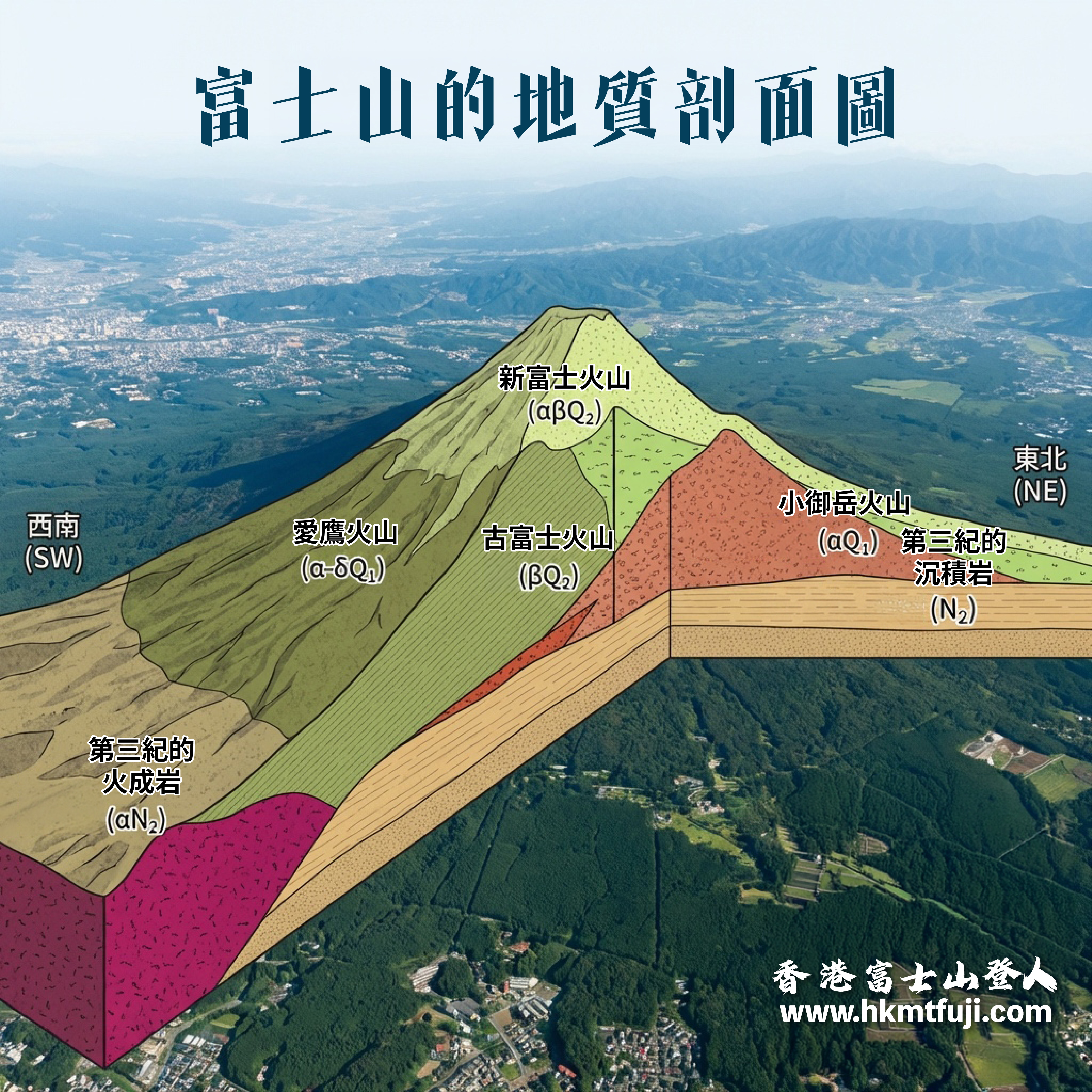 - 新富士Shin-Fuji (上層): 約 1.1 萬年前至今的活動,主體以玄武岩質熔岩流為主,堆積形成了現在看到的完美圓錐外形狀